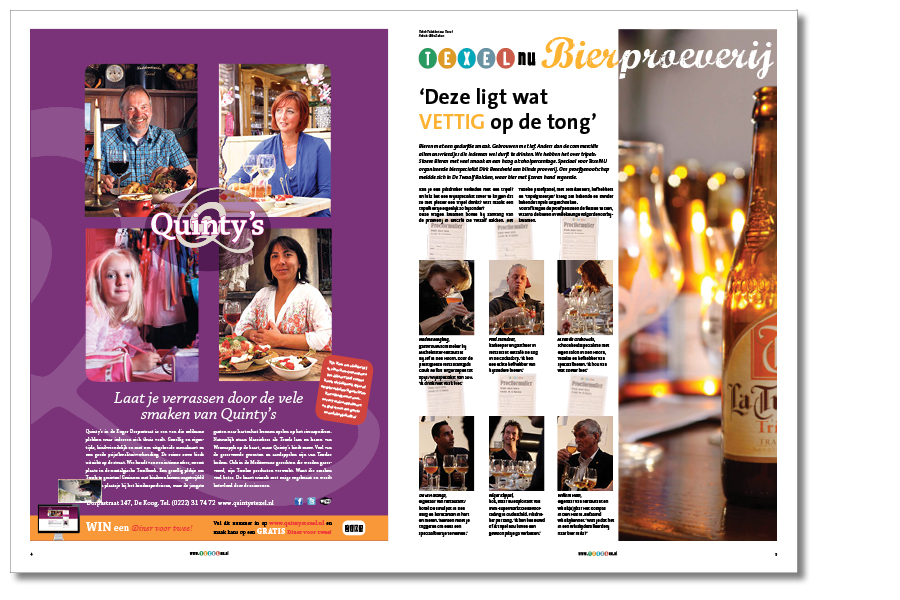 De TexelNU-krant: een gratis krant voor de Texeltoerist. De krant is tevens een aansprekend podium voor de enthousiaste ondernemers op het eiland. Iedere uitgave heeft een passend (seizoens)thema; in dit geval werd een bierproeverij georganiseerd in café De 12 Balcken in Den Burg. Eén van proefsters was Nadine Mögling, gastvrouw/sommelier bij restaurant Bij Jef in Den Hoorn.