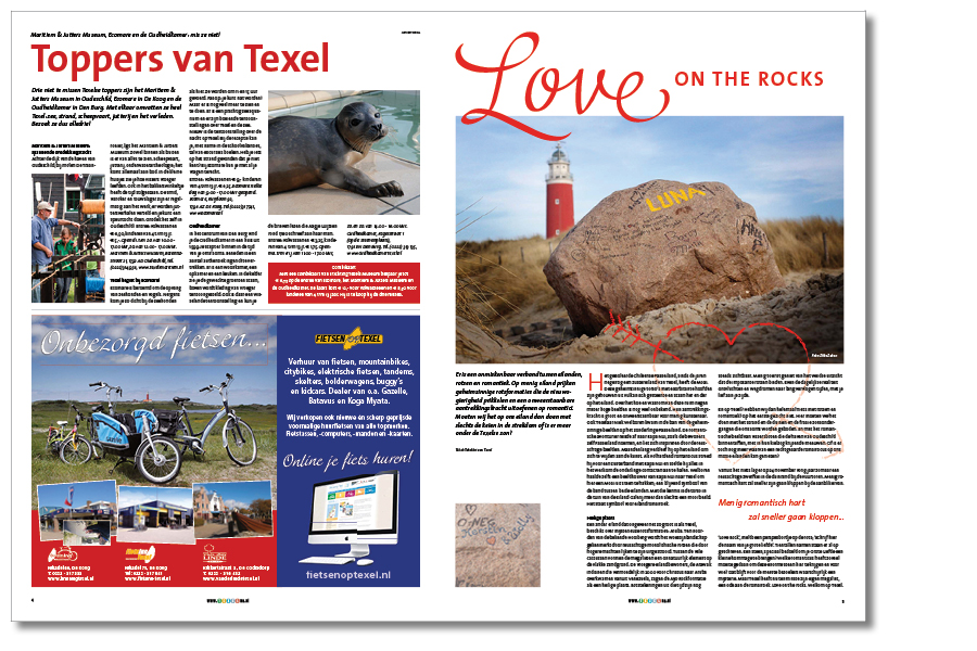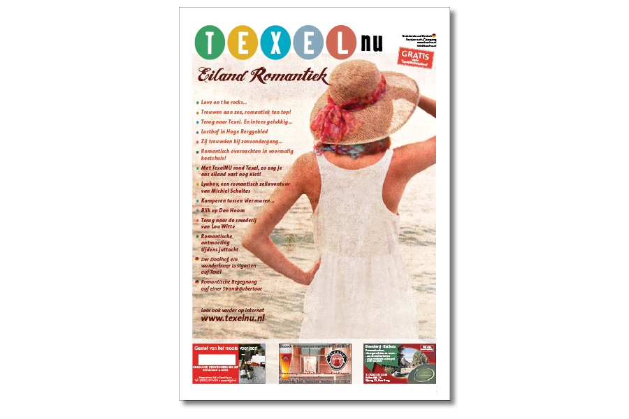 De TexelNU-krant: een gratis krant voor de Texeltoerist. De krant is tevens een aansprekend podium voor de enthousiaste ondernemers op het eiland. Iedere uitgave heeft een passend (seizoens)thema; in dit geval was dat: Romantisch Texel.