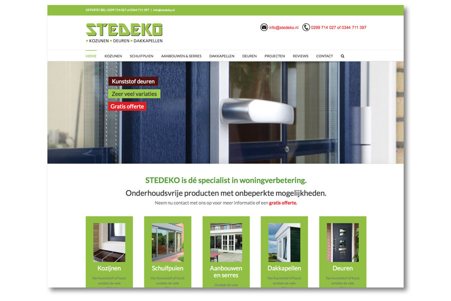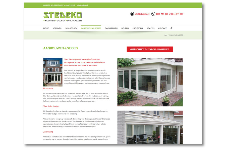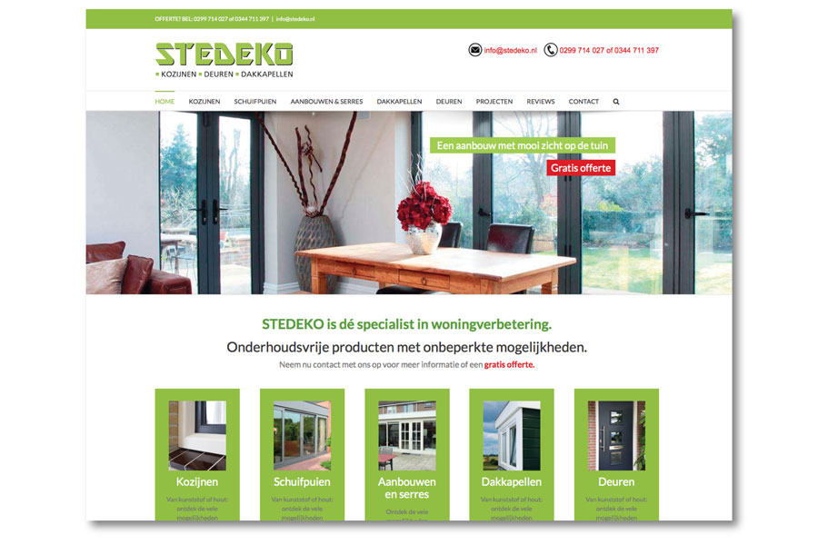 Stedeko is dé specialist in woningverbetering. Ze werken voornamelijk met onderhoudsvrije producten die onbeperkte mogelijkheden bieden. Van kozijnen tot en met een aanbouw, serre of dakkapel; Stedeko kan het allemaal.
